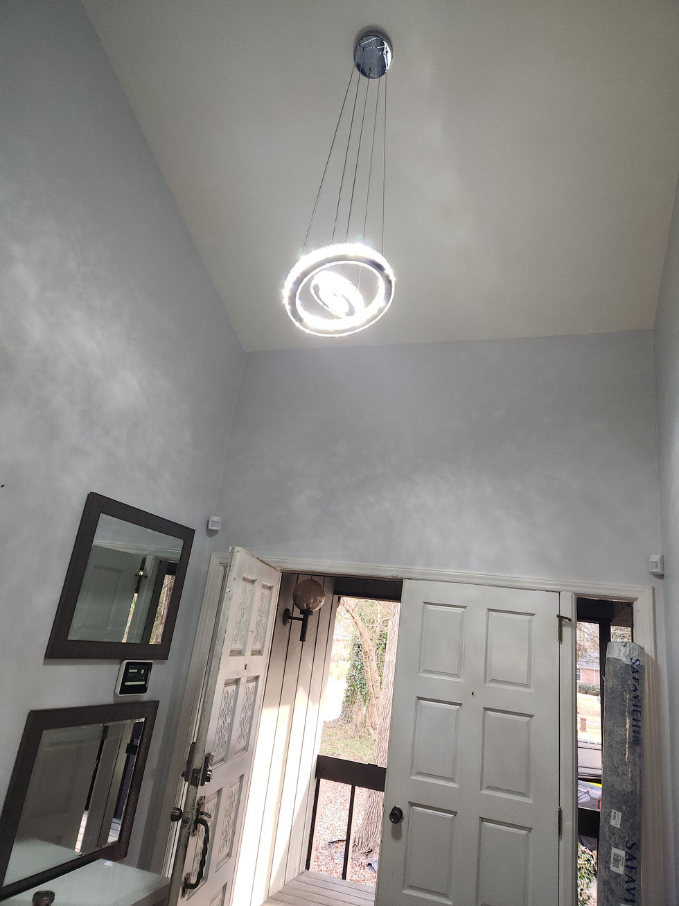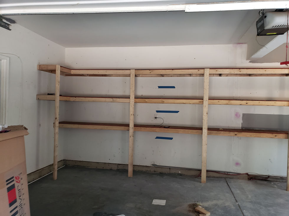 Discover our garage organization solutions, featuring wooden shelves, organized storage, and a modern entryway with circular hanging light fixture.
